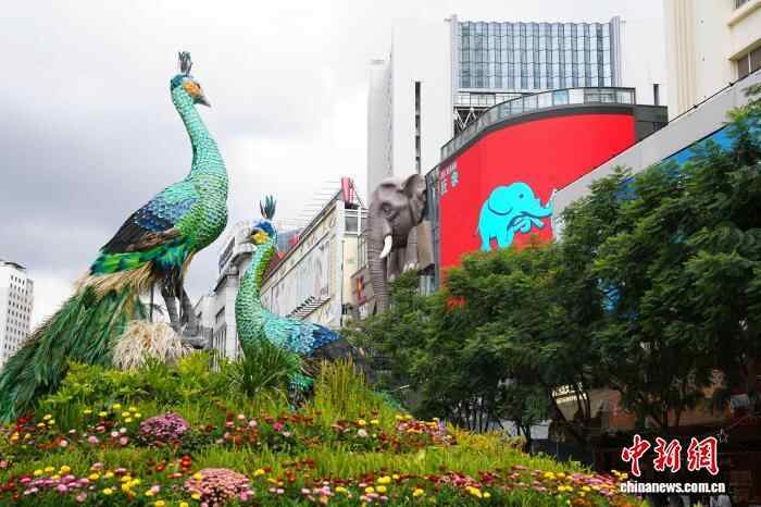 10月10日,大象艺术装置和孔雀雕塑相映成趣。中新社记者 刘冉阳 摄