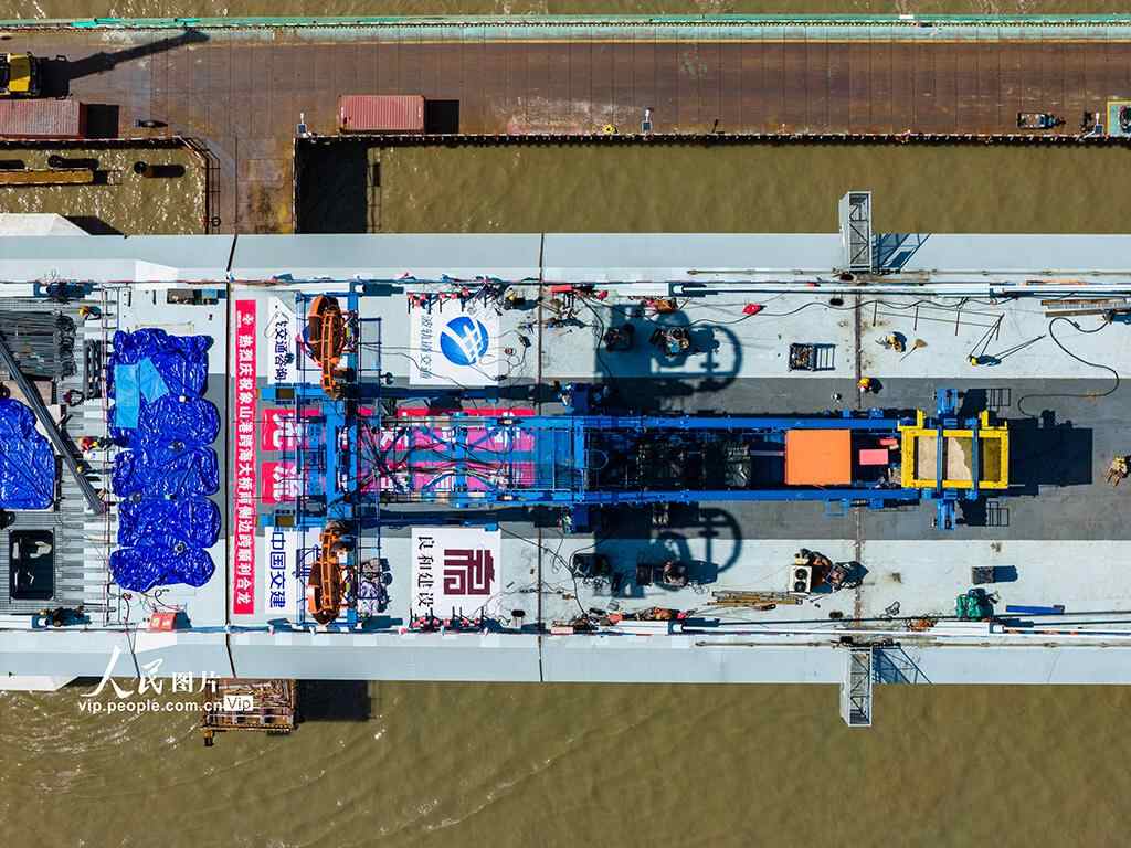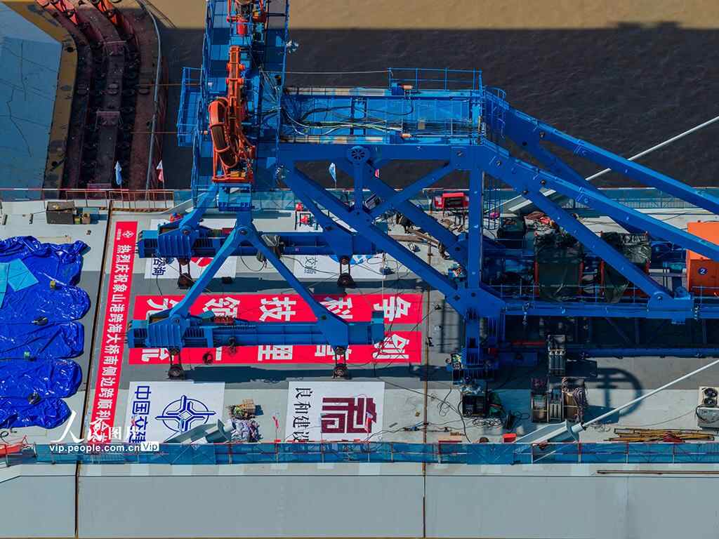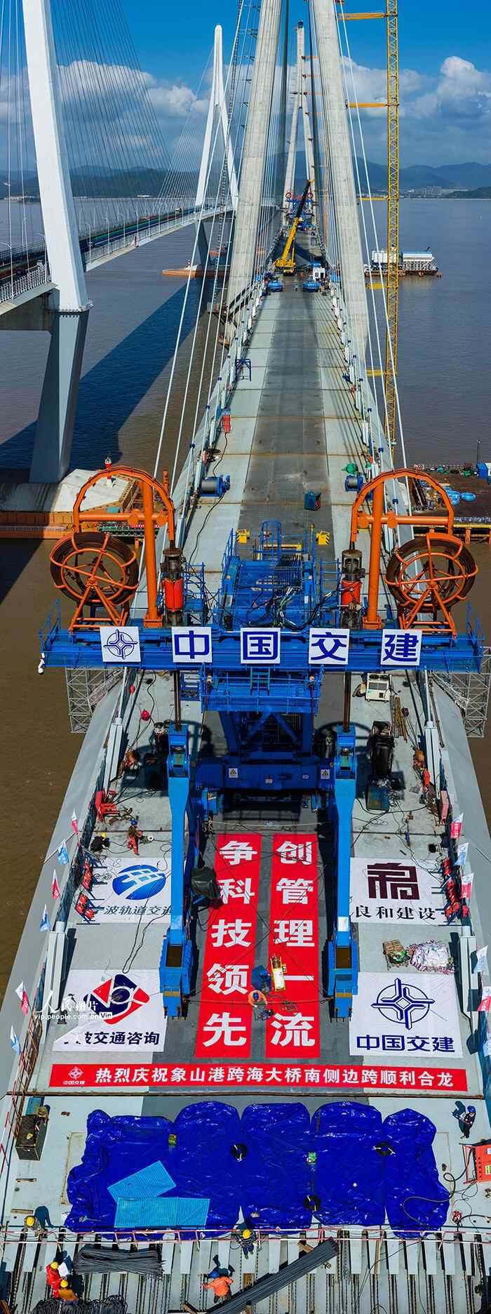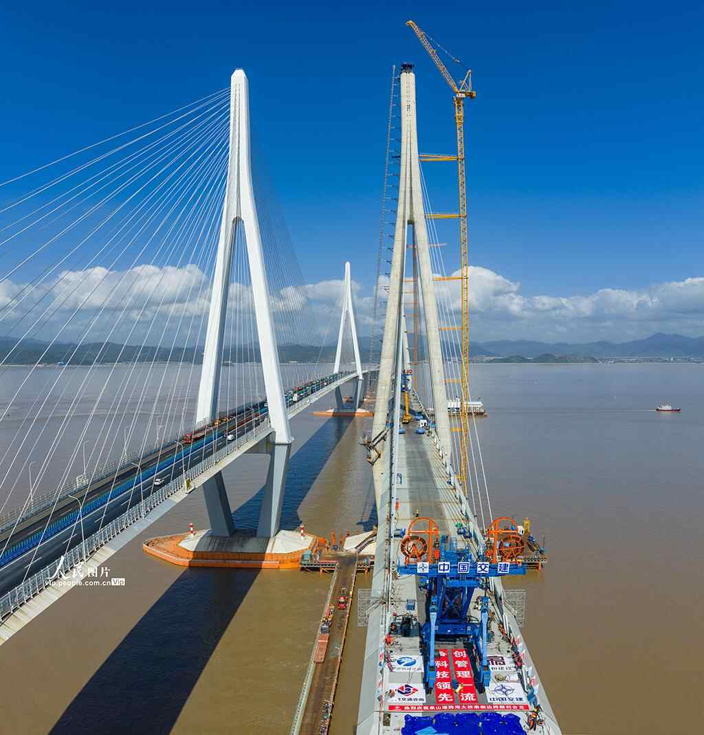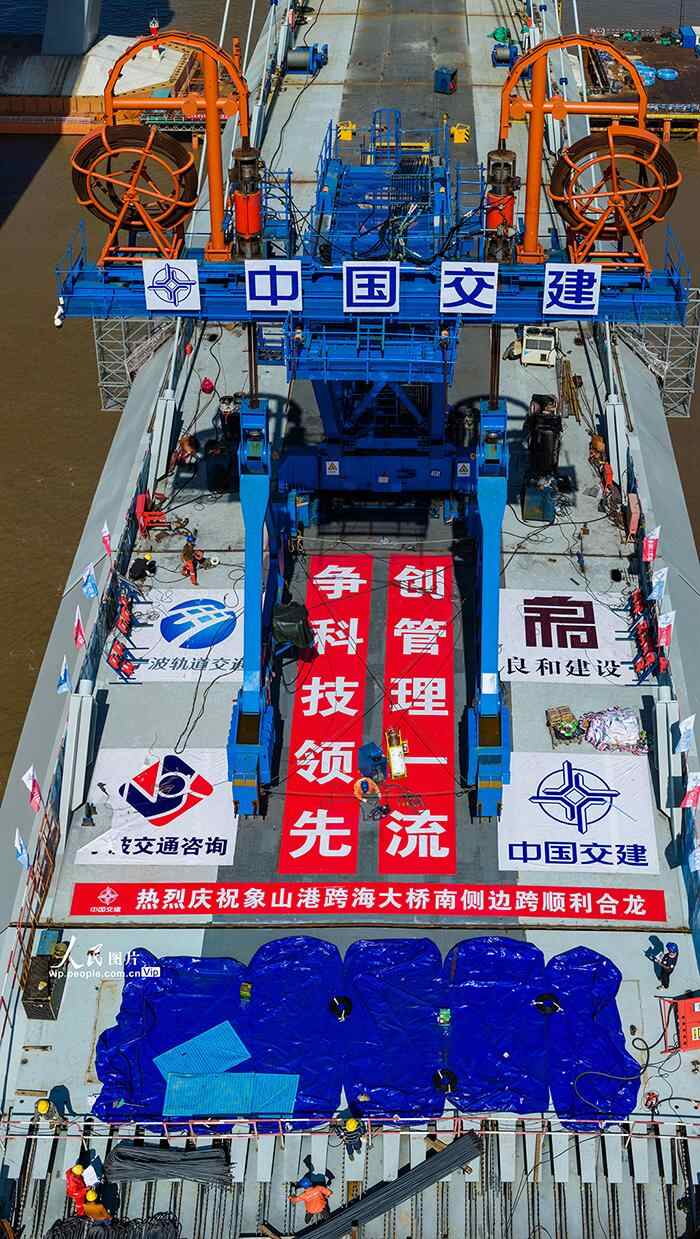 2025年10月10日,浙江宁波市域铁路象山港跨海大桥南侧边跨顺利合龙。沈颖俊摄(人民图片网)