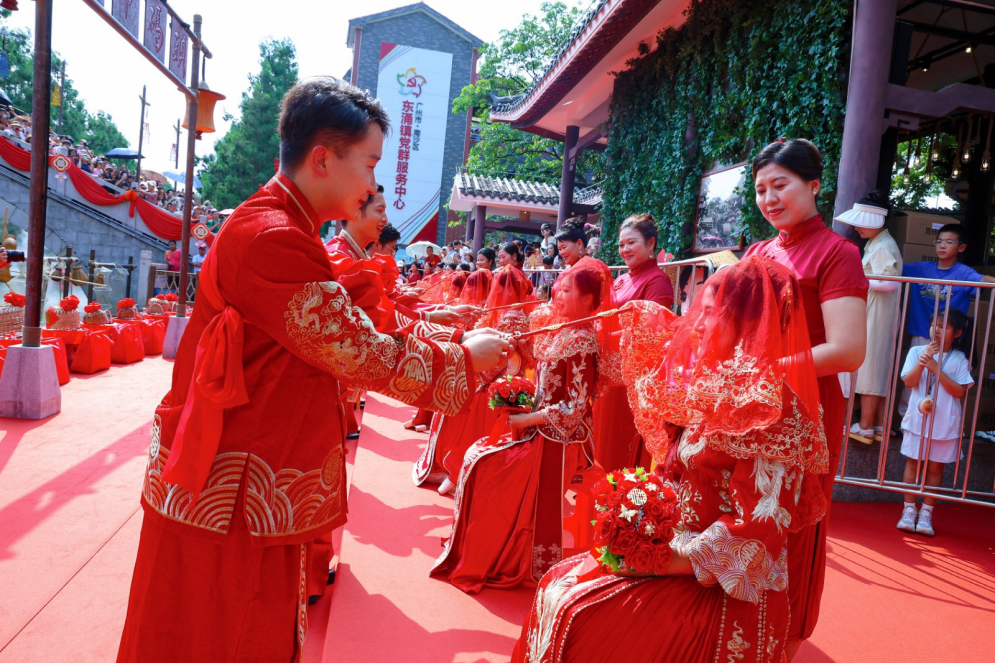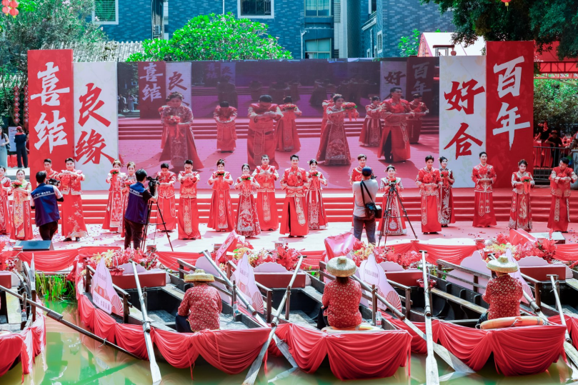 水上花艇迎亲、非遗婚俗仪式……近日,广州市南沙区东涌镇第七届水乡集体婚礼在“东涌里”圆满举行。来自大湾区不同行业的10对新人,以传统疍家婚俗形式喜结连理,生动传播新时代家风文化。