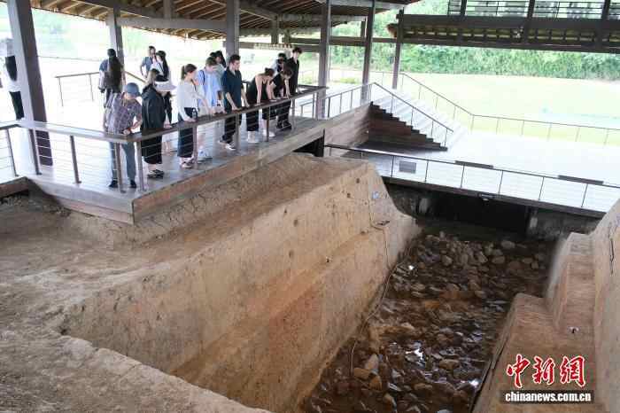 2025年6月,中外青年在良渚古城遗址公园内了解遗址细节。曹丹 摄