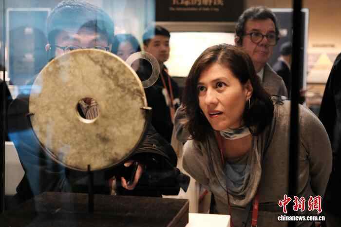 2024年11月,第二届“良渚论坛”期间,墨西哥考古学家帕特里西娅·莱德斯玛·保茜在杭州良渚博物院内的良渚玉璧前驻足细看。曹丹 摄