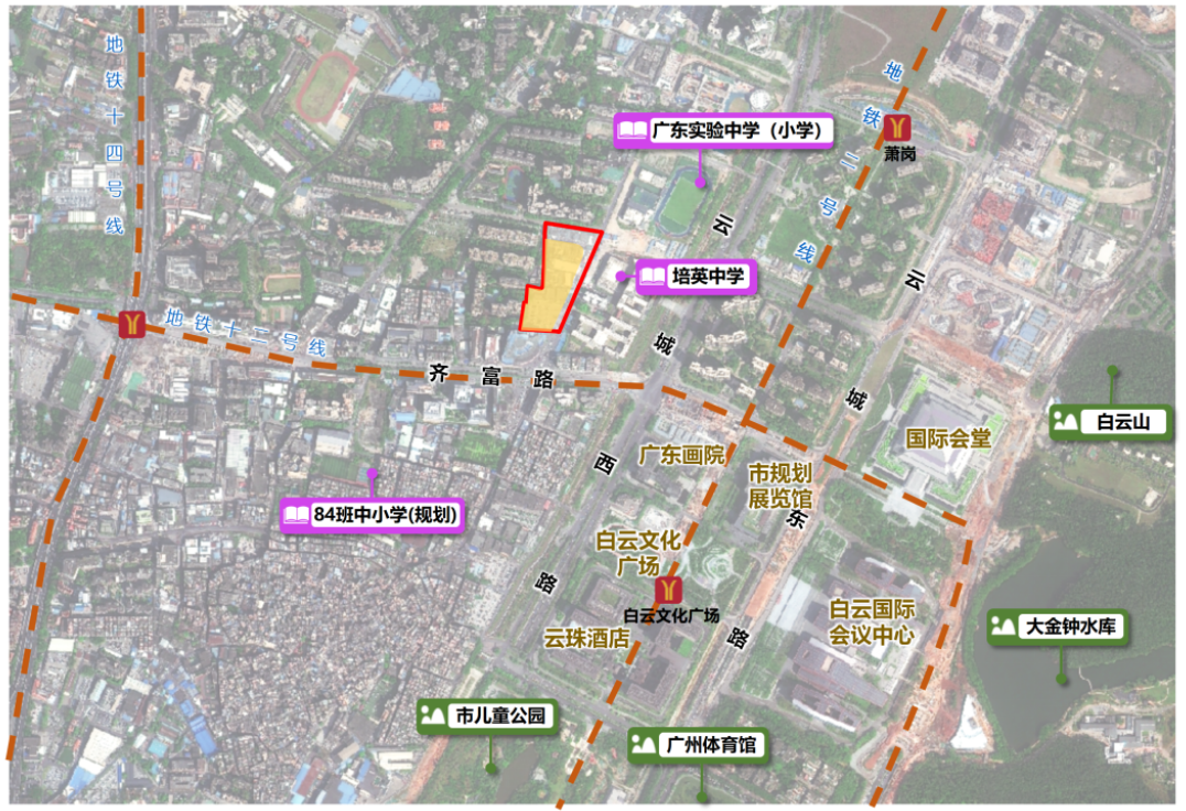 地块优势在于其为云山珠水轴(白云山-珠江西航道)的重要节点,地处白云新城核心区,临近广州地铁二号线、十二号线白云文化广场站和萧岗站,距白云国际会议中心1公里,距白云机场约25公里,与广州火车站、广州白云站均相距不远,区位优势明显。