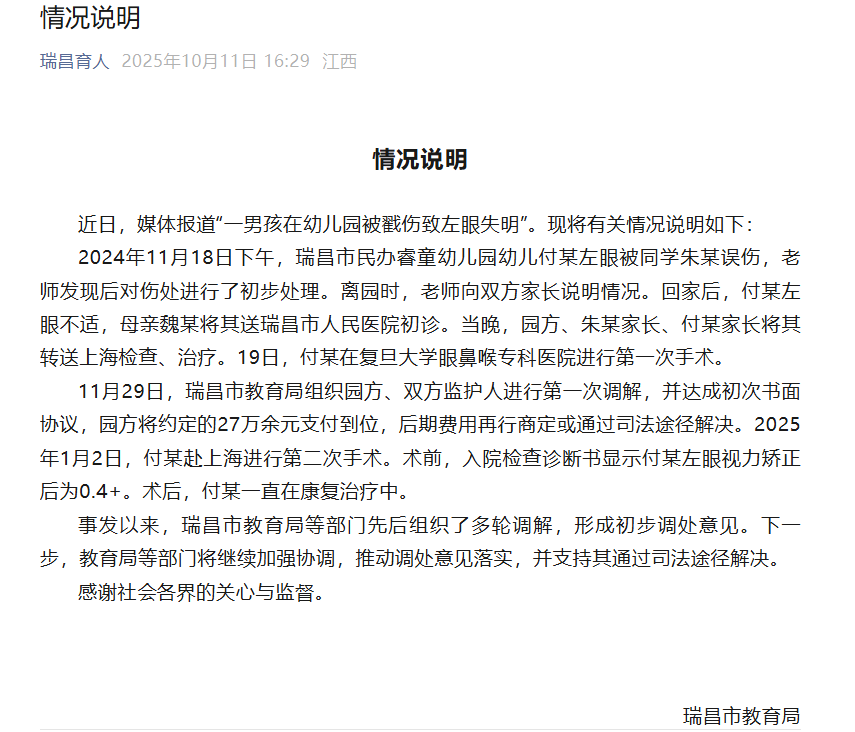 近日,媒体报道“一男孩在幼儿园被戳伤致左眼失明"。现将有关情况说明如下:2024年11月18日下午,瑞昌市民办睿童幼儿园幼儿付某左眼被同学朱某误伤,老师发现后对伤处进行了初步处理。离园时,老师向双方家长说明情况。回家后,付某左眼不适,母亲魏某将其送瑞昌市人民医院初诊。当晚,园方、朱某家长、付某家长将其转送上海检查、治疗。19日,付某在复旦大学眼鼻喉专科医院进行第一次手术。