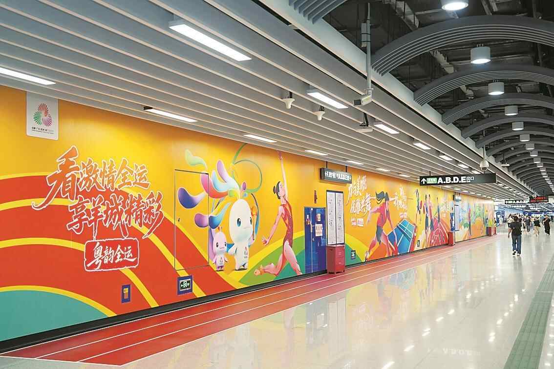 此外,广州地铁还在广州东站换乘通道同步推出“羊城八景”“食在广州”主题长卷,向旅客展示城市风光与美食文化;体育中心站出入口也已完成全运氛围布置,让市民从步入地铁起,即感受到扑面而来的全运热情。