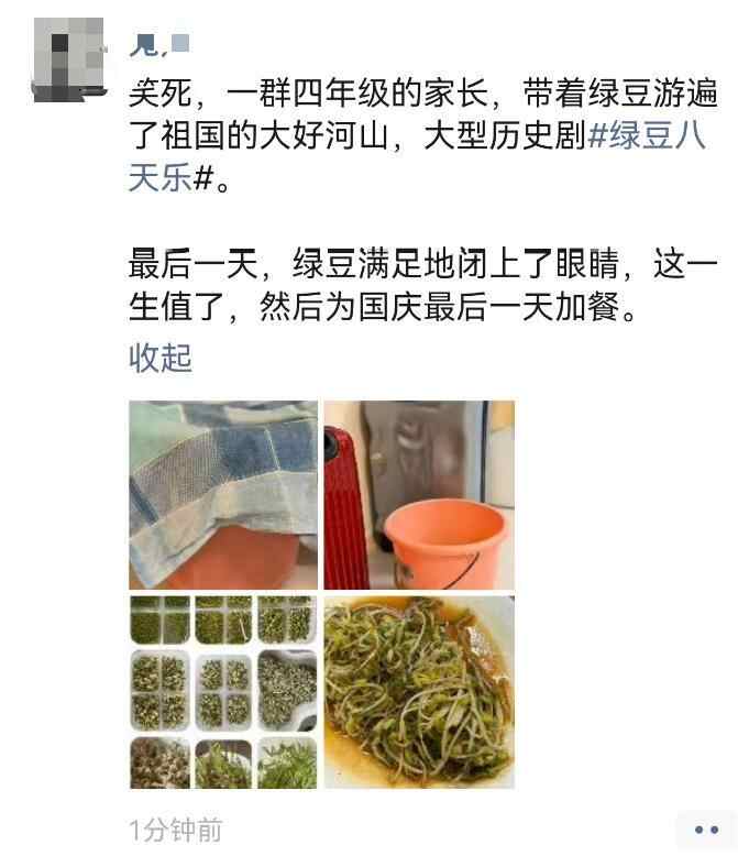 “笑死,一群四年级的家长,带着绿豆游遍了祖国的大好河山,大型历史剧#绿豆八天乐#。”陈女士的孩子在杭州一所小学四年级就读,秋假前,语文老师布置了这个作业,让孩子们在小长假里观察绿豆发芽的生长过程。