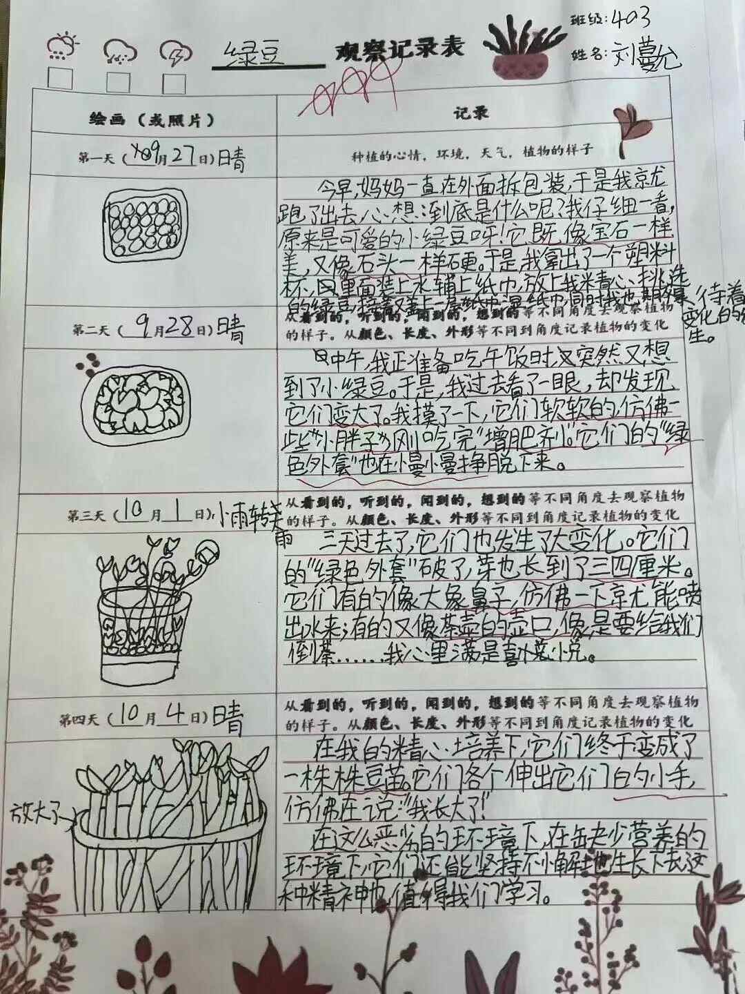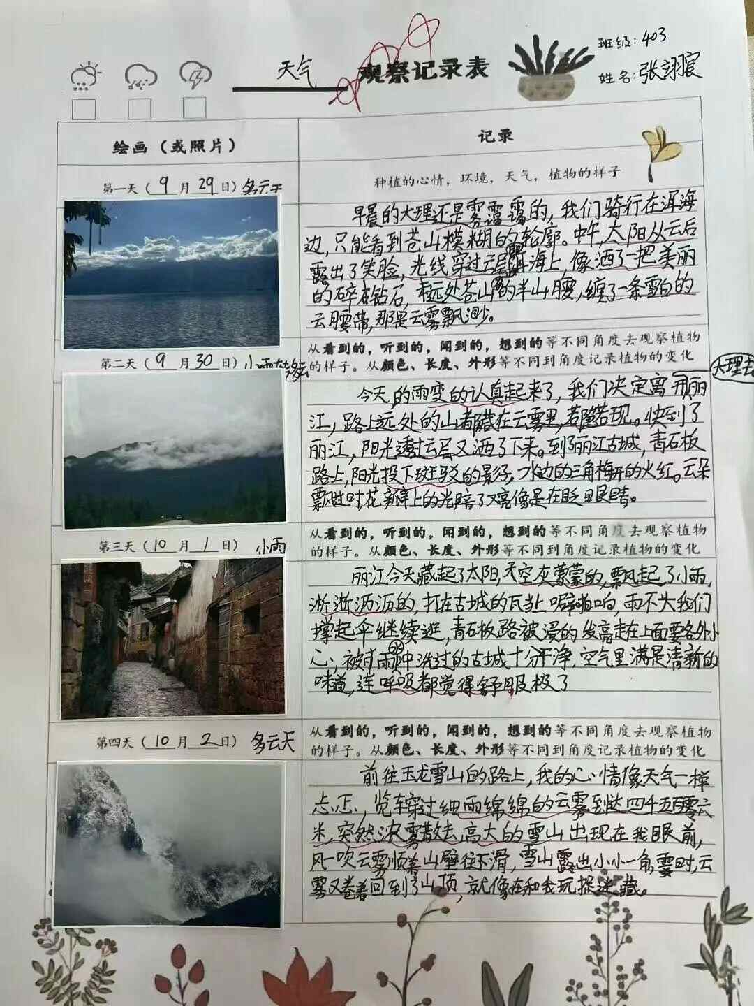不过在布置作业时,很多老师的要求不仅限于绿豆,学生也可以观察其他的植物,或者一周的天气变化,小动物的成长变化等等。比如在朴老师班上,有的孩子到云南大理旅游,记录了大理的天气变化,有的没出门,就记录了国庆期间钱塘江潮水的变化。家长和孩子可以根据自身情况灵活选择。