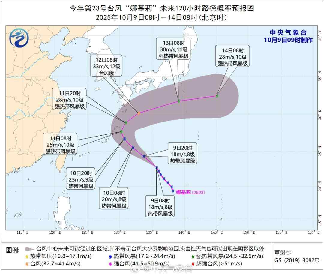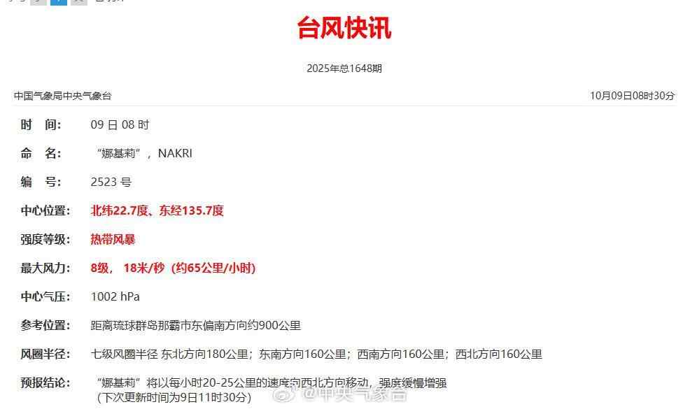另外,台风“娜基莉”今天8时位于距离琉球群岛那霸市东偏南方向约900公里的洋面上,中心附近最大风力8级(18米/秒,热带风暴级)。
