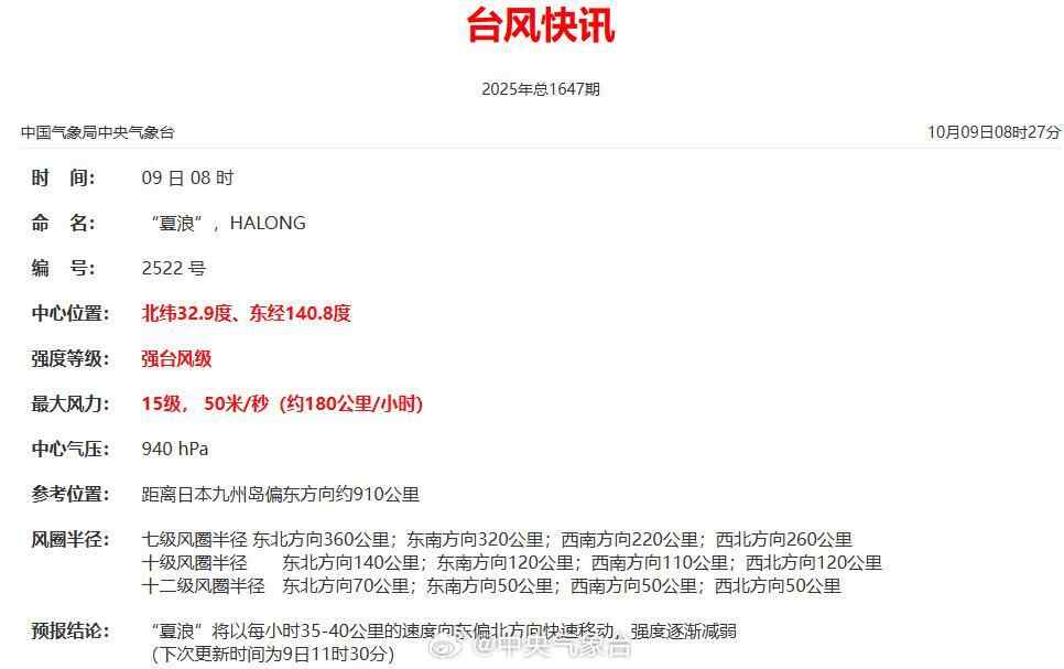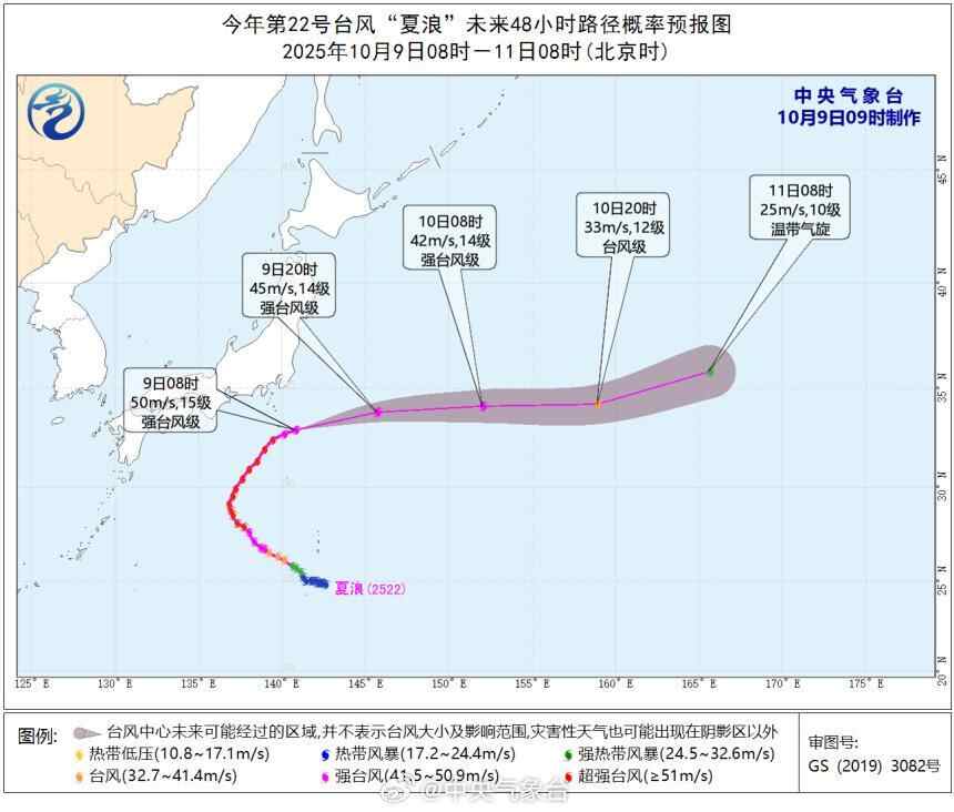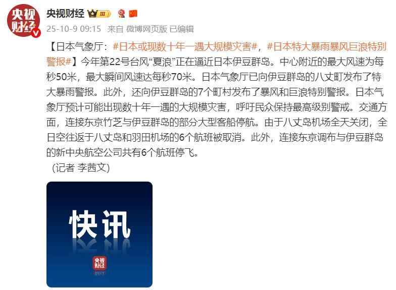10月9日,今年第22号台风“夏浪”正在逼近日本伊豆群岛。中心附近的最大风速为每秒50米,最大瞬间风速达每秒70米。日本气象厅已向伊豆群岛的八丈町发布了特大暴雨警报。