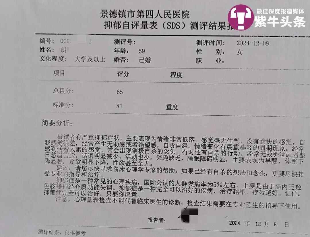 胡女士称,事故发生后不久,自己和老伴因为睡眠和幻听问题去医院就诊,确诊了重度抑郁症和创伤后应激障碍,“我总是听到救护车的声音,听到殡仪馆奏哀乐的声音,整宿整宿地睡不着,一闭眼就听见儿子、儿媳喊‘救命’,不满一岁的孙子睁着大眼睛直勾勾地看着我。”胡女士说,她老伴的情况比她更严重一些,“他有时连话都说不出来,浑身发抖、出汗。”