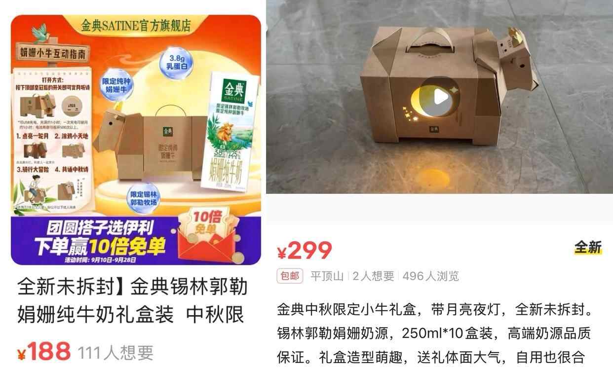 对此,多平台旗舰店客服均告诉记者,该款小牛盒产品目前已售罄,也有多家门店员工告诉记者小牛盒已售罄。在二手平台上,这款原价56-74.9元,内含8瓶-10瓶牛奶的娟姗小牛礼盒装,售价被炒至188元-299元,溢价至近4倍。