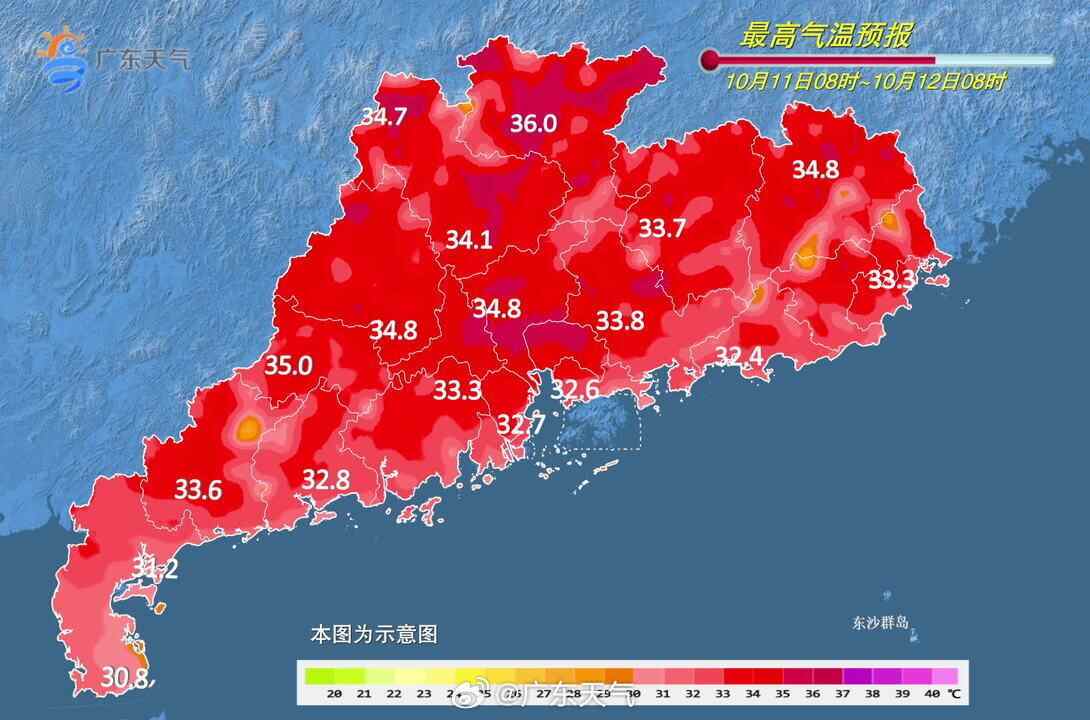 ◆11日,广东南部市县多云间阴天,有分散(雷)阵雨,其余市县多云间晴天,局部有(雷)阵雨。最高气温:中北部市县33~36℃,其余市县31~33℃。