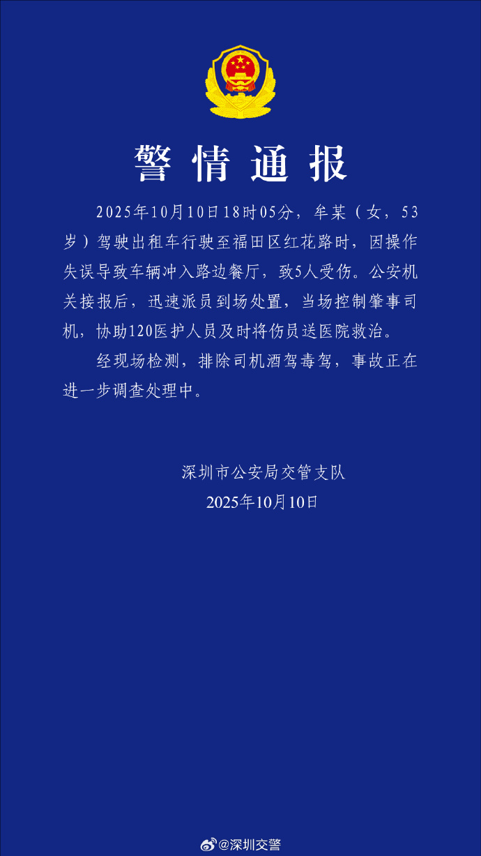 10月10日,@深圳交警发布警情通报:2025年10月10日18时05分,牟某(女,53岁)驾驶出租车行驶至福田区红花路时,因操作失误导致车辆冲入路边餐厅,致5人受伤。公安机关接报后,迅速派员到场处置,当场控制肇事司机,协助120医护人员及时将伤员送医院救治。
