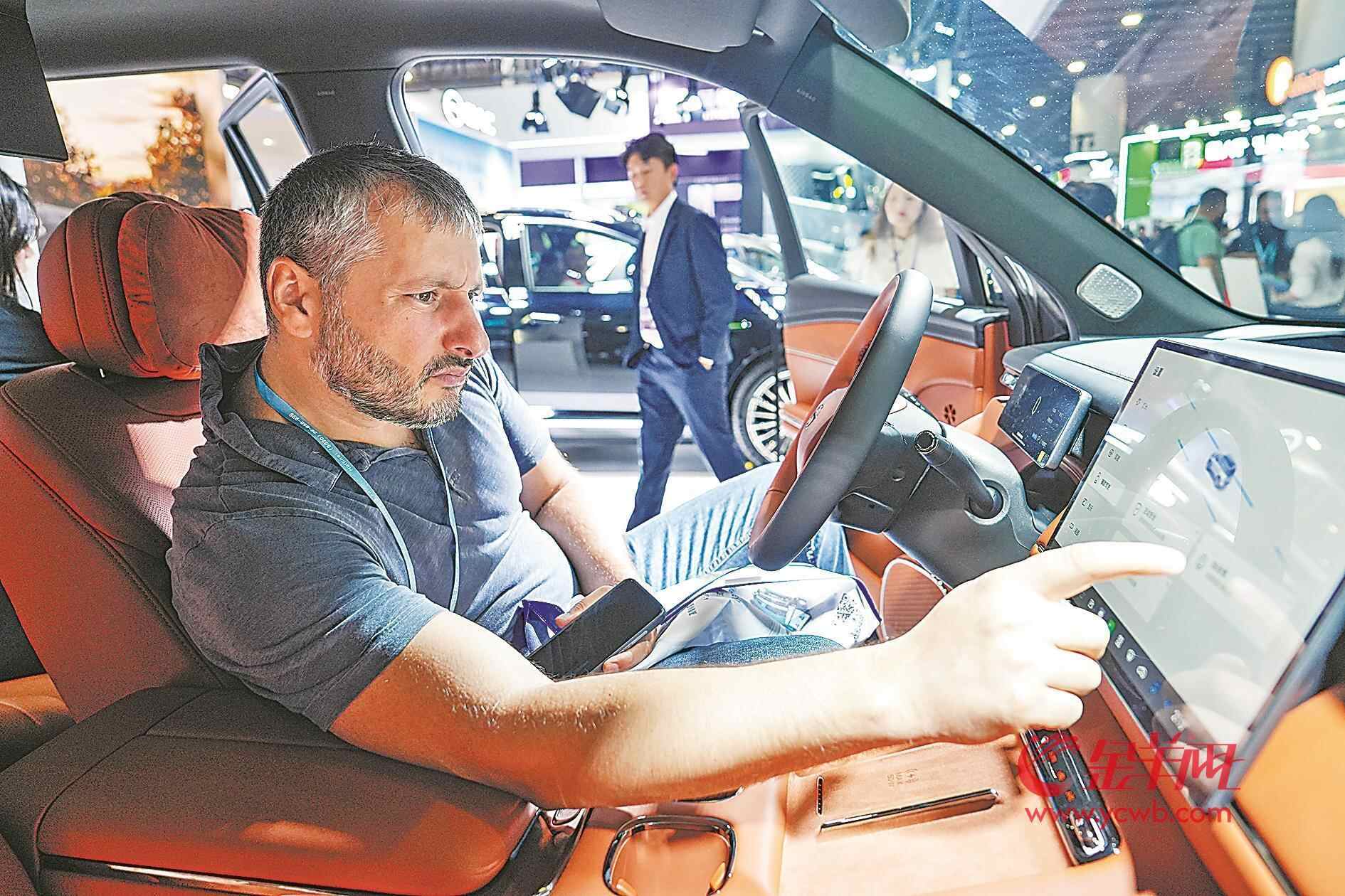 在这场全球规模的贸易盛会上,“中国智造”锋芒毕露。记者现场看到,新能源汽车与智慧出行展区备受瞩目,外国客商纷至沓来,大部分展台待客能力“高饱和”,采购商们要排队等待试车和询价交流。