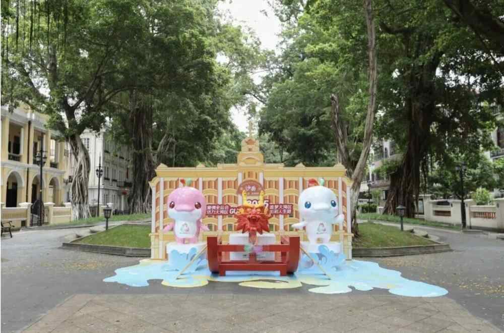 “喜洋洋”“乐融融”化身跳水选手,中间还设有精美的龙船造型,现代竞技叠加荔湾传统民俗运动,为沙面岛注入了运动活力。