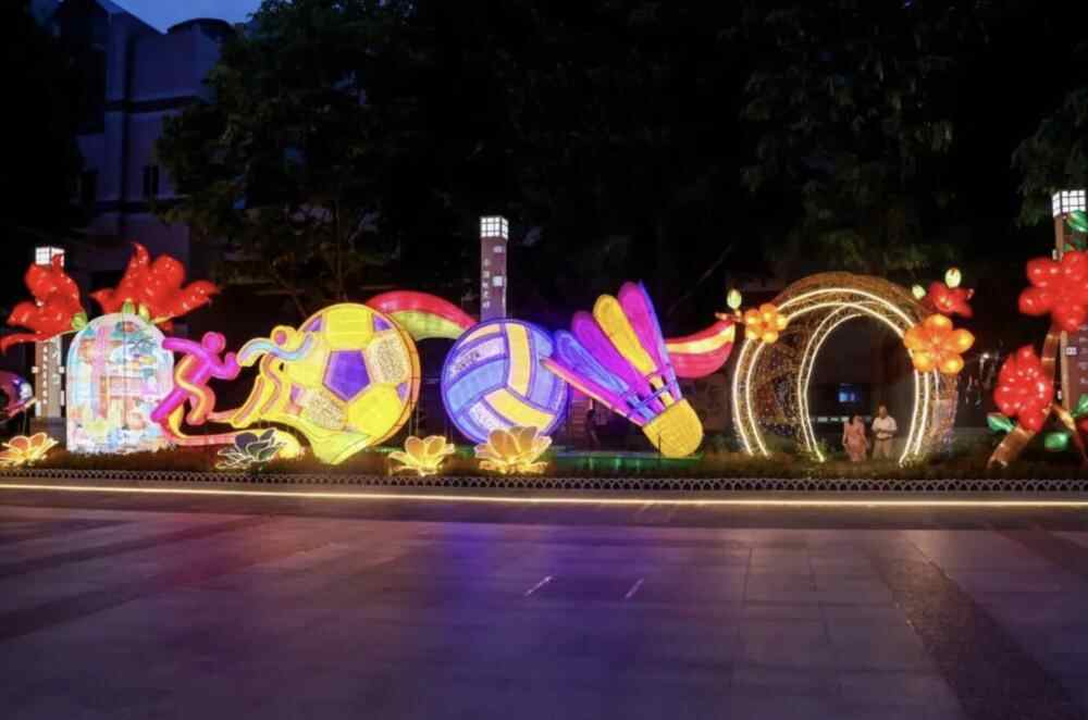 广州文化公园“中秋灯会”融合岭南非遗与全运元素,核心灯组《乘风破浪海天阔》,以彩灯形式动态呈现全运会吉祥物和多项运动项目造型。公园中轴线六组运动主题光雕,勾勒了羽毛球、游泳、举重、田径等运动项目的动态瞬间,打造了彩灯与体育精神交融的视觉盛宴。