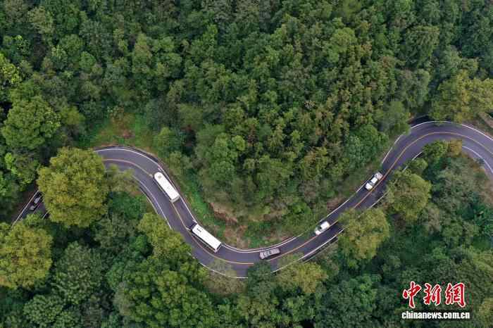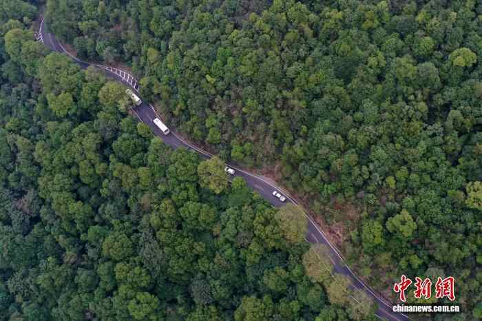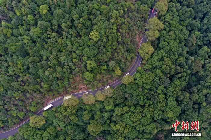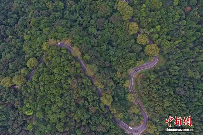 10月16日,车辆在蜿蜒的江西庐山登山公路上行驶。(无人机照片)中新社记者 刘占昆 摄