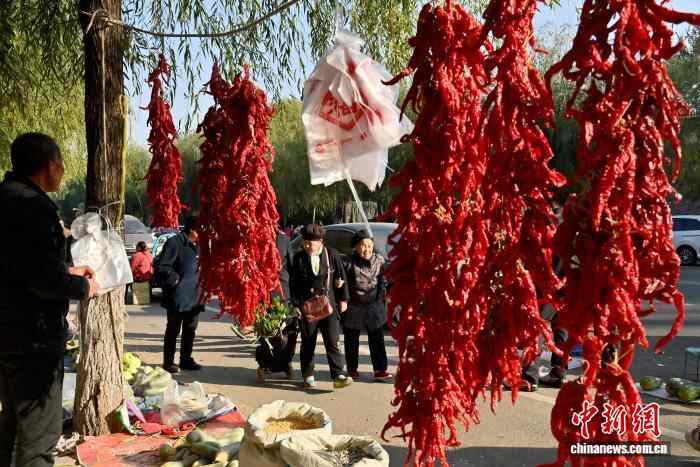 10月16日,吉林长春,红辣椒被菜农摆在显眼位置。中新社记者 张瑶 摄