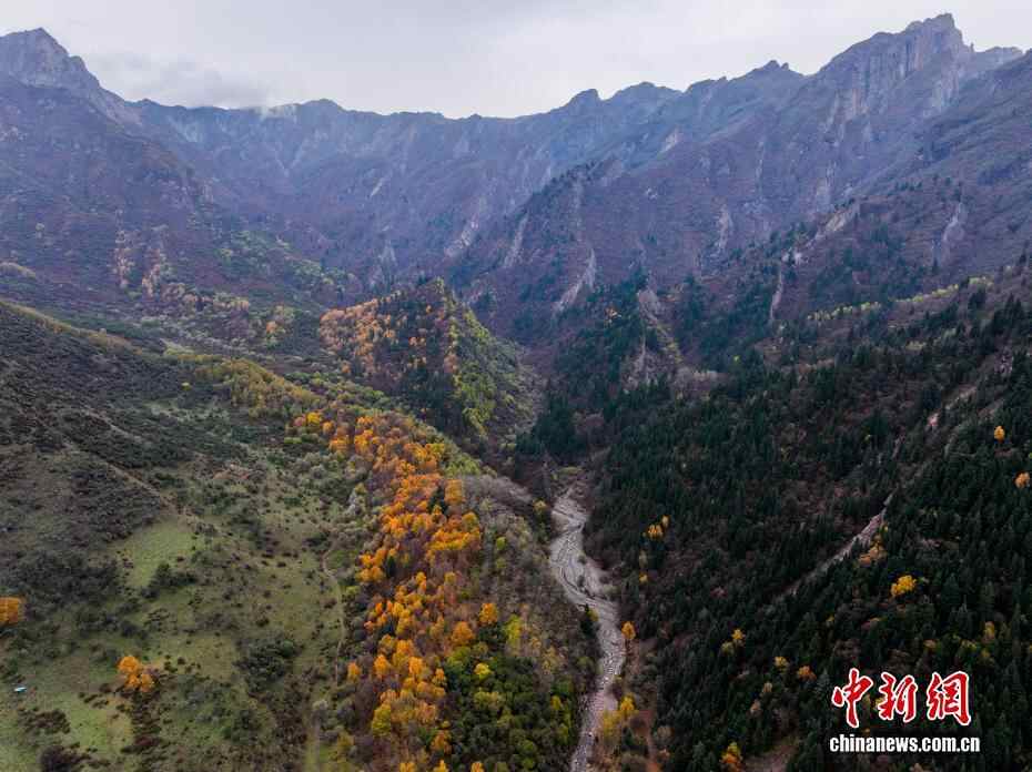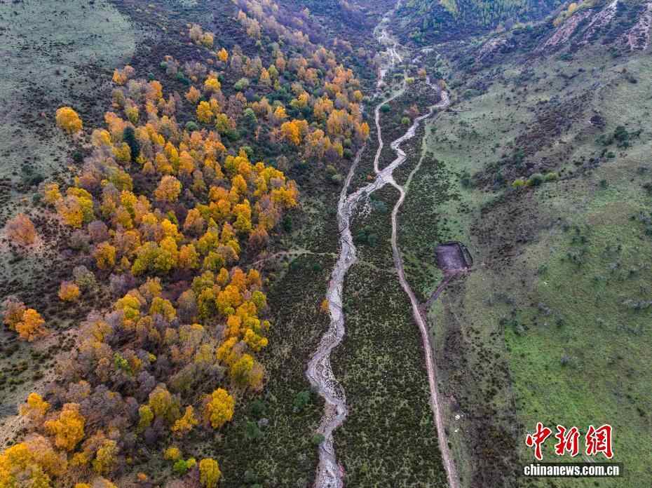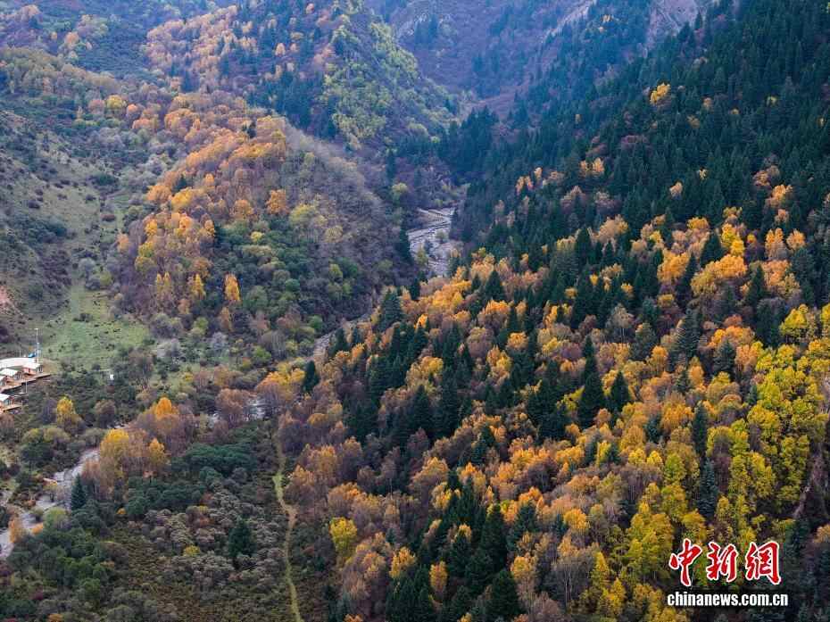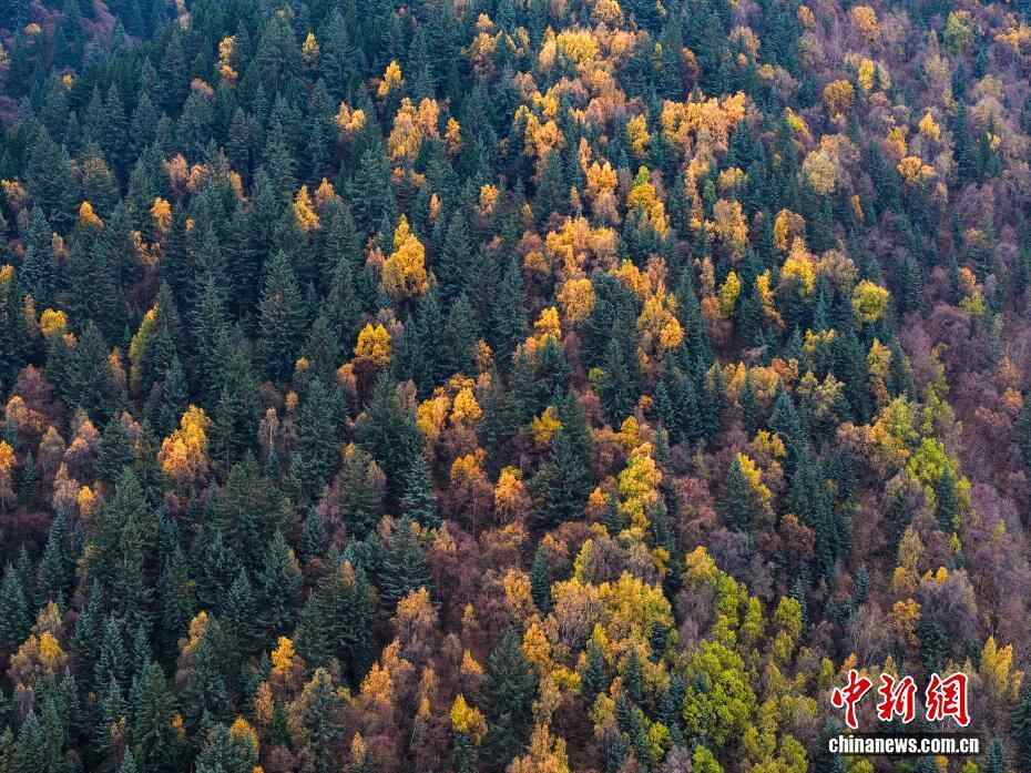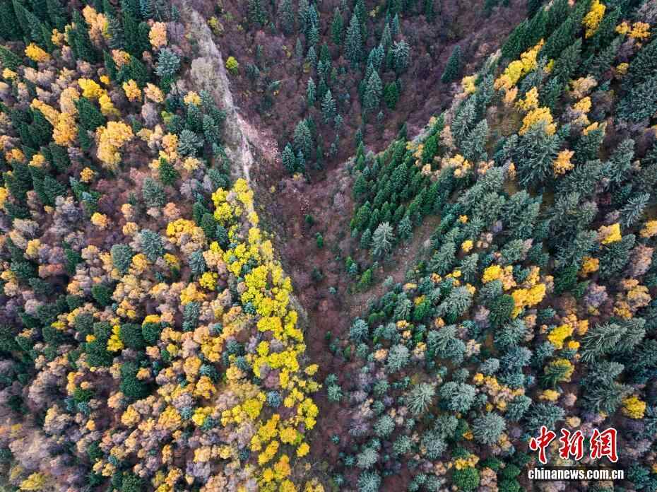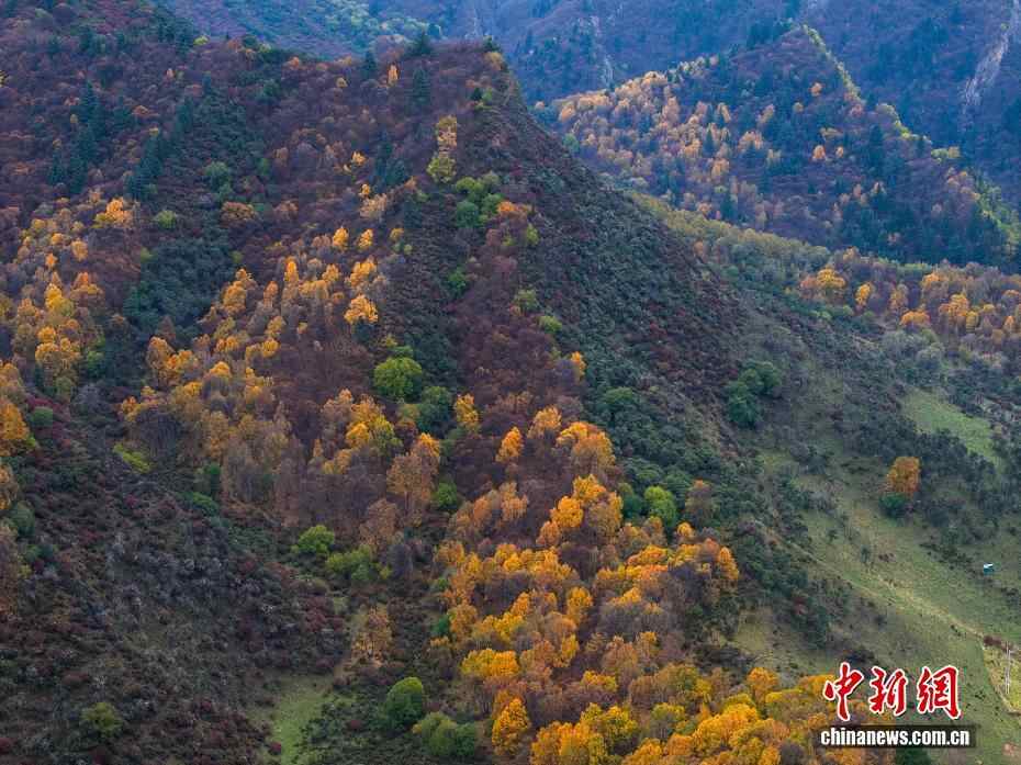 10月16日,航拍位于青海省西宁市湟中区的群加国家森林公园秋日美景。群山之中,金黄、火红的树叶与苍翠的松柏交织,构成一幅绚丽的秋日画卷。图为群加国家森林公园。(无人机照片)