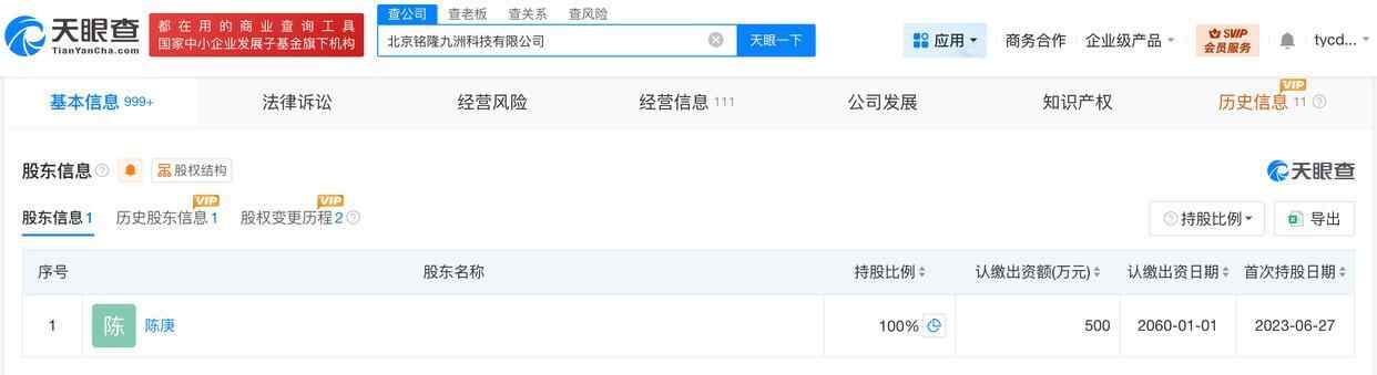 天眼查App显示,北京铭隆九洲科技有限公司成立于2022年5月,法定代表人为陈庚,注册资本500万人民币,经营范围包括珠宝首饰制造、日用品销售、建筑用金属配件制造、市场营销策划等。股东信息显示,该公司由陈庚全资持股。年报信息显示,该公司2024年参保人数为0。