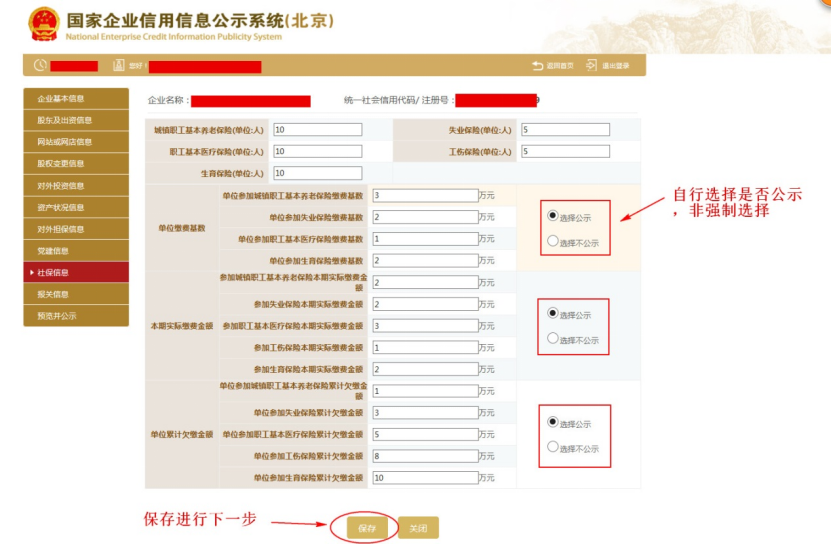 企业登陆填报系统后,需要填写社保信息,其中参保人数是需要企业结合实际情况进行填写,并自行选择是否公示。