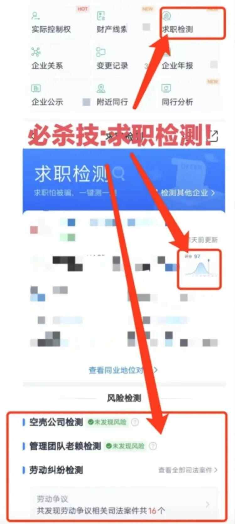 接下来,放大招!求职检测包含劳动纠纷检测、经营风险检测、管理团队老赖检测等多种方式,可以全方位帮你洞察这家公司的靠谱程度!