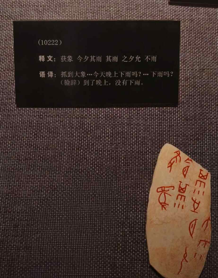 据现场铭牌展示释文,该甲骨记录为:“获象,今夕其雨,其雨,之夕允,不雨。”意思是“抓到大象……今天晚上下雨吗?……下雨吗?(验辞)到了晚上,没有下雨。”