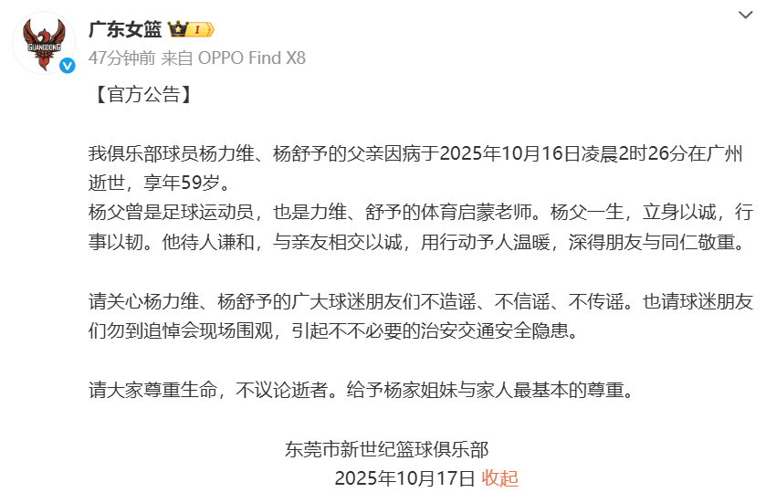 10月17日,@广东女篮 发布微博哀悼杨力维、杨舒予父亲逝世: