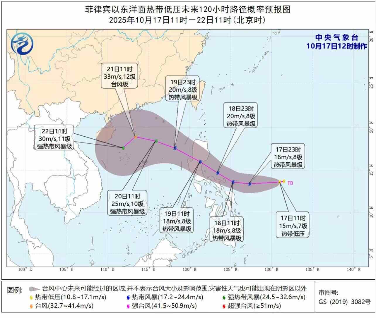 根据中央气象台观测,一个热带低压于10月17日上午在菲律宾以东洋面生成。