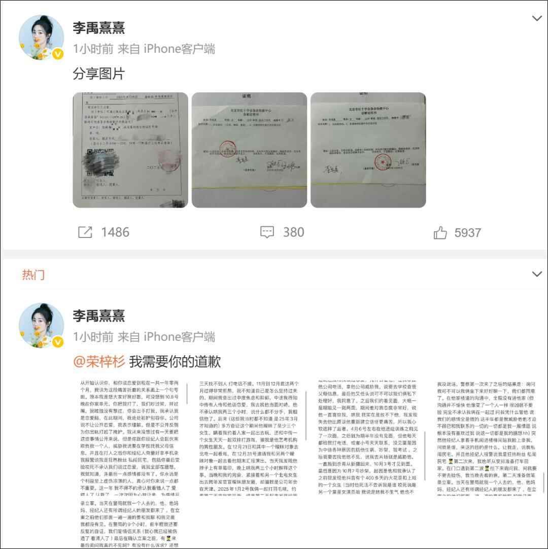 10月15日,女演员李禹熹发文喊话19岁男演员荣梓杉,发长文曝光荣梓杉恋爱期间出轨、打人,她一度确诊中度焦虑和抑郁。她还晒出了医院的诊断证明书和公安机关的立案告知书等照片。