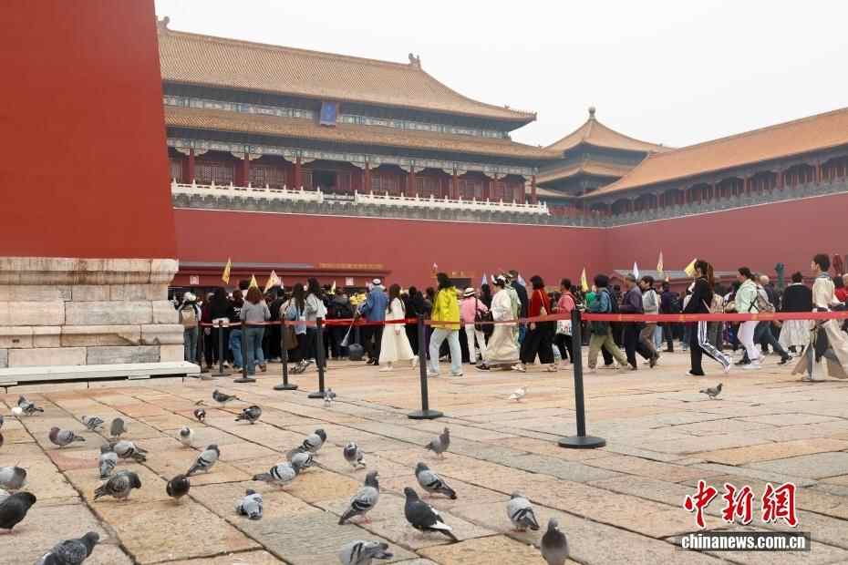 10月15日,众多游客在北京故宫午门广场前排队,等待进入故宫参观。近日,故宫博物院迎来建院100周年,特展《百年守护》引发大规模观展热潮。图为游客身着古装排队。