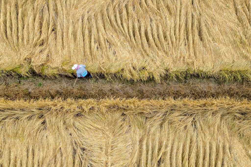 10月14日,在黑龙江省牡丹江市西安区福兴村,村民将收割的水稻装车(无人机照片)。新华社记者 张涛 摄