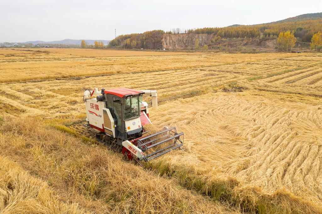 10月14日,在黑龙江省牡丹江市西安区福兴村,村民驾驶收割机收割水稻。新华社记者 张涛 摄
