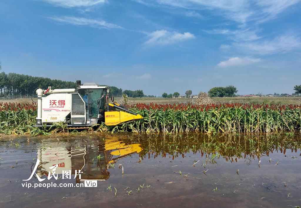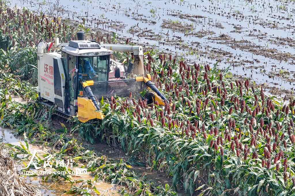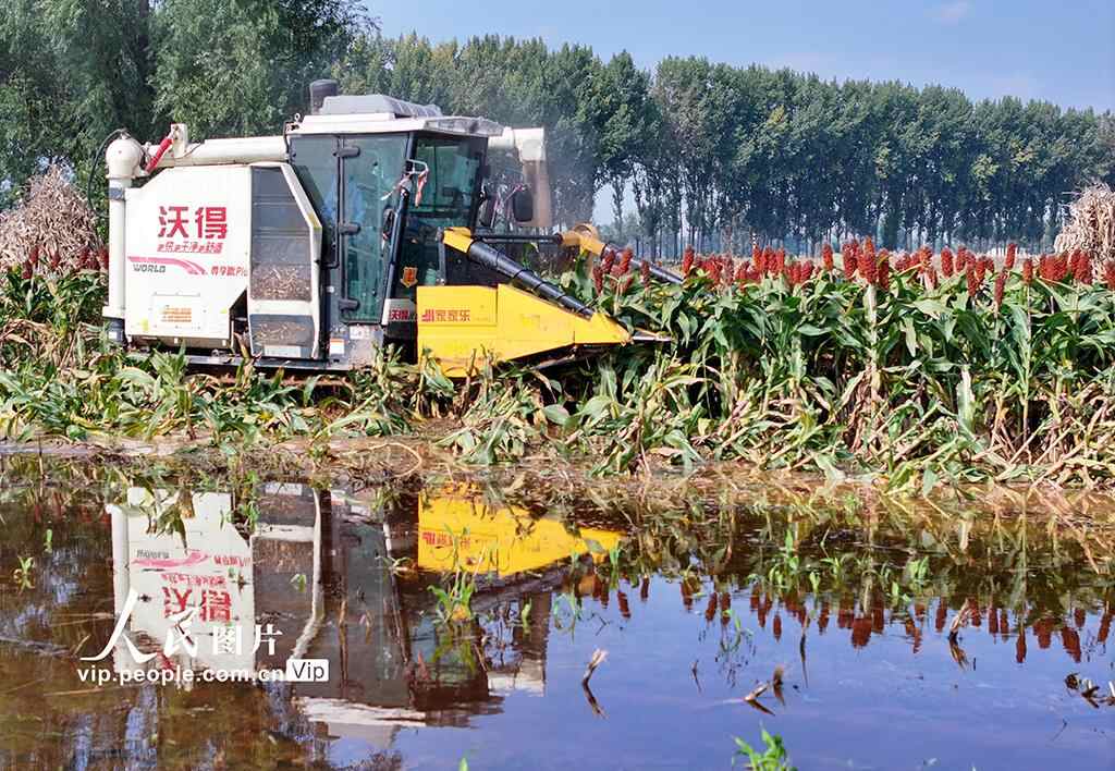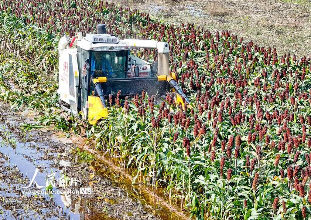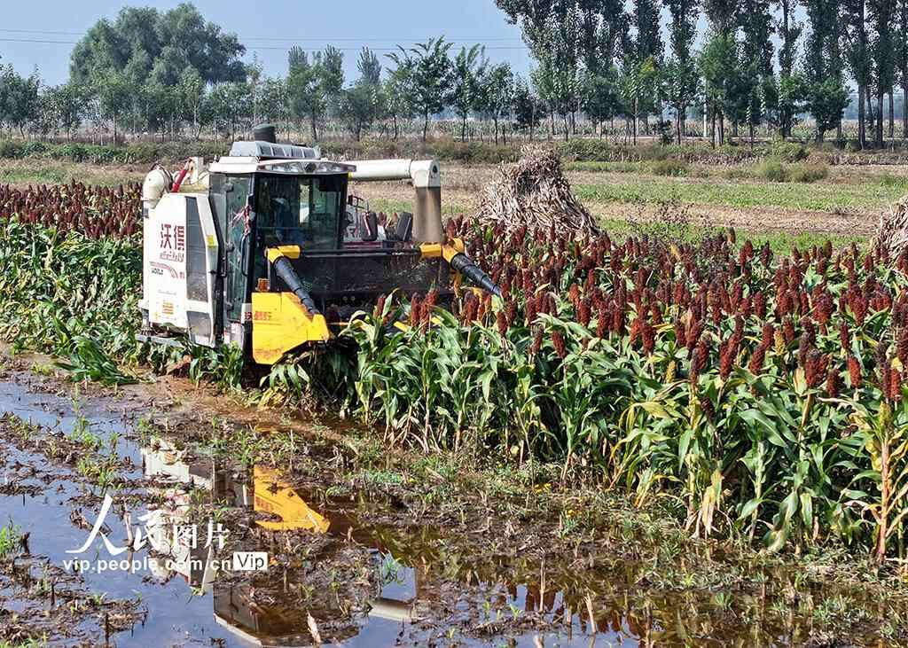 2025年10月15日,在山西省晋中市平遥县宁固镇丰依村,农机手驾驶履带式收割机抢收高粱。梁生仁摄(人民图片网)