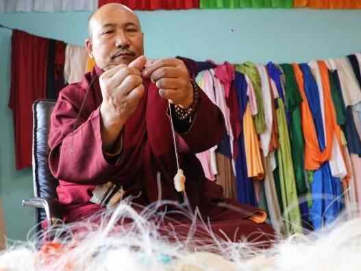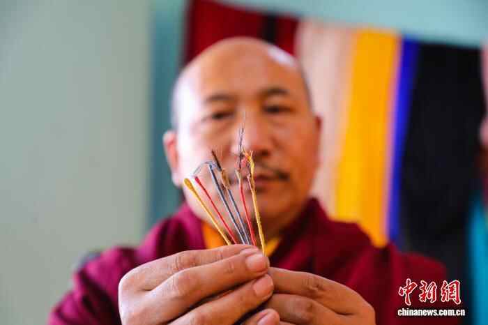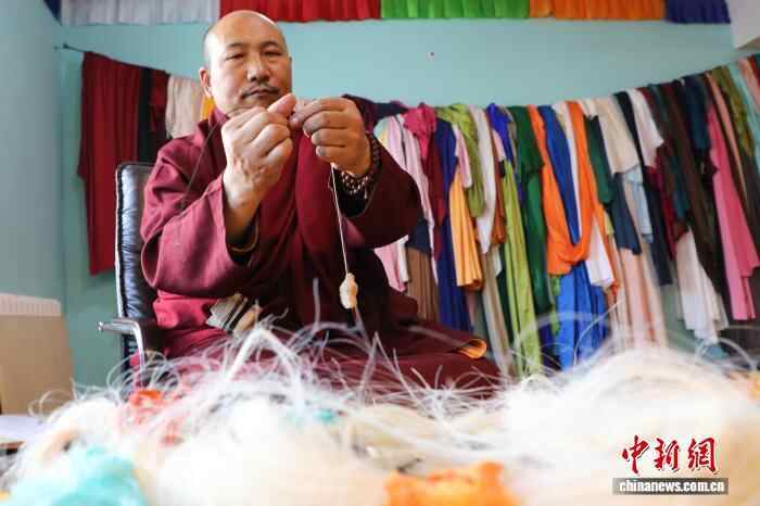 10月15日,在青海省果洛藏族自治州班玛县藏族唐卡(班玛马尾钉线绣唐卡)传习所内,传承人土登伟色展示以多根马尾为纵线,将不同色彩丝线缠绕于马尾上制成的马尾钉线。藏族唐卡(班玛马尾钉线绣唐卡)以马尾与丝线组合勾线为特色,融合刺绣、堆绣与绘画技艺,至今已有四百多年的历史,题材涵盖藏族历史、文化、生活等领域,画面具有浮雕感的立体效果且保存长久,于2021年列入第五批国家级非物质文化遗产名录。近年来,班玛县通过非遗技艺培训,有效推动了传统技艺传承与就业增收。中新社记者 马铭言 摄