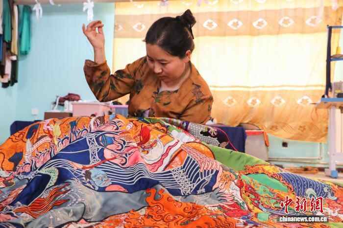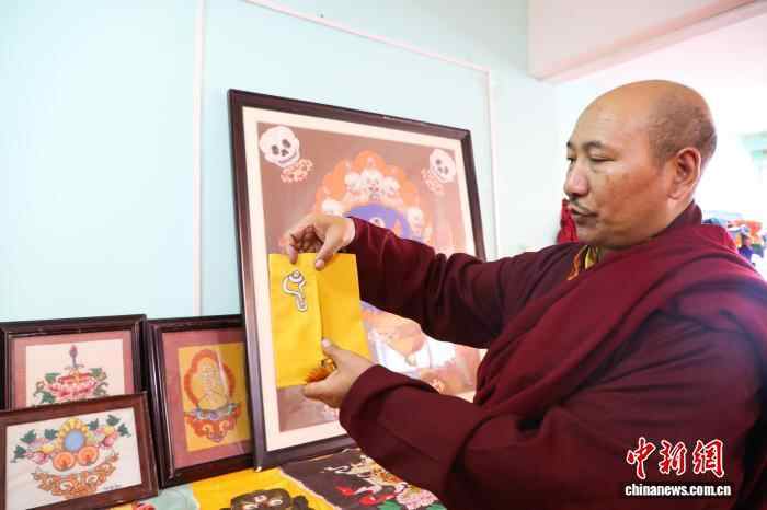 10月15日,在青海省果洛藏族自治州班玛县藏族唐卡(班玛马尾钉线绣唐卡)传习所内,传承人土登伟色介绍,近年来,班玛马尾钉线绣唐卡制作技艺得到创新运用。藏族唐卡(班玛马尾钉线绣唐卡)以马尾与丝线组合勾线为特色,融合刺绣、堆绣与绘画技艺,至今已有四百多年的历史,题材涵盖藏族历史、文化、生活等领域,画面具有浮雕感的立体效果且保存长久,于2021年列入第五批国家级非物质文化遗产名录。近年来,班玛县通过非遗技艺培训,有效推动了传统技艺传承与就业增收。中新社记者 马铭言 摄
