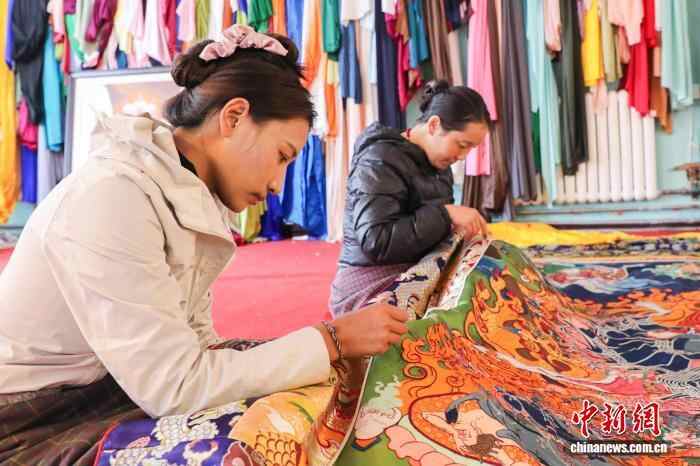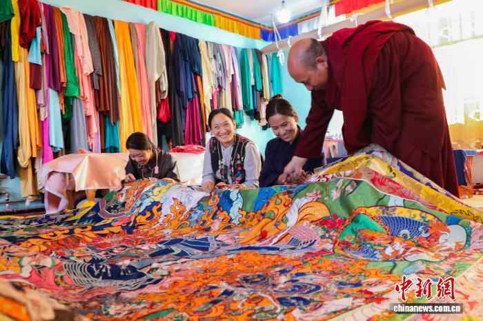 10月15日,在青海省果洛藏族自治州班玛县藏族唐卡(班玛马尾钉线绣唐卡)传习所内,传承人土登伟色(右一)指导学员绣制藏族唐卡(班玛马尾钉线绣唐卡)。藏族唐卡(班玛马尾钉线绣唐卡)以马尾与丝线组合勾线为特色,融合刺绣、堆绣与绘画技艺,至今已有四百多年的历史,题材涵盖藏族历史、文化、生活等领域,画面具有浮雕感的立体效果且保存长久,于2021年列入第五批国家级非物质文化遗产名录。近年来,班玛县通过非遗技艺培训,有效推动了传统技艺传承与就业增收。中新社记者 马铭言 摄