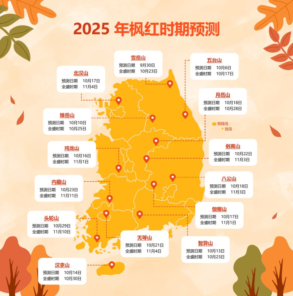 根据最新发布的2025年赏枫预测,韩国枫叶全盛期将于10月下旬至11月中旬到来。今年枫红时间较去年平均推迟3-8天,各地最佳观赏期错落有致:智异山、汉拿山、北汉山和内藏山的最佳观赏期将分别集中于10月23日、10月30日、11月4日和11月11日左右。