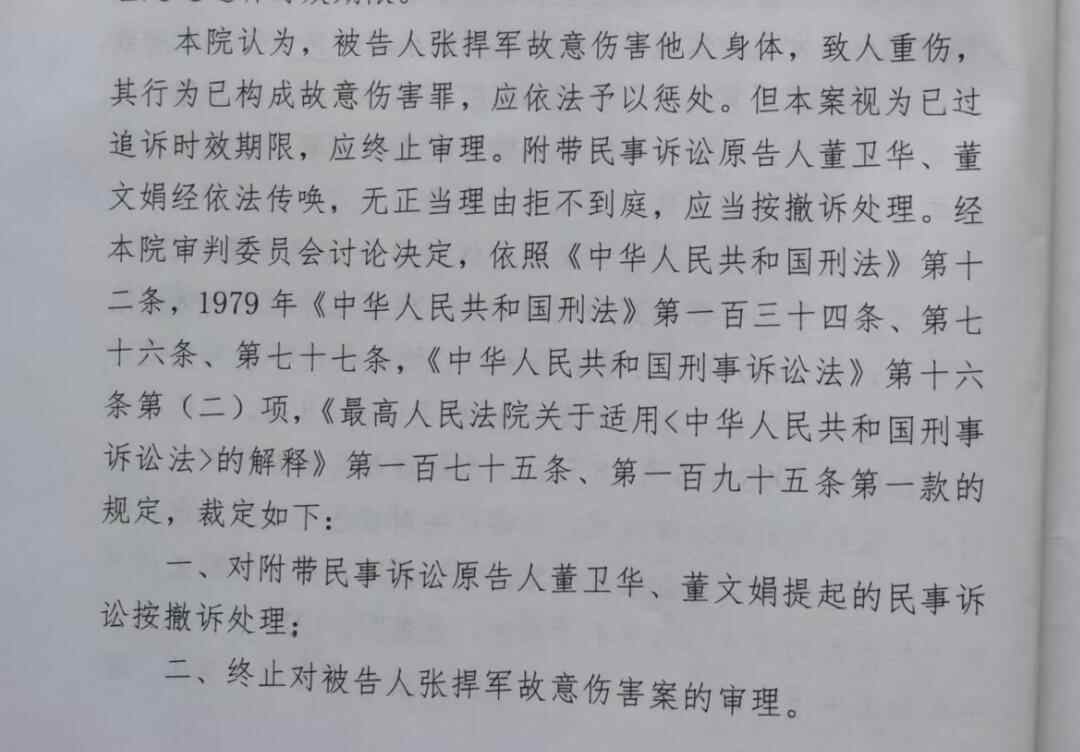 2025年9月,张捍军收到了元氏县法院下达的裁定书,和前一次类似,认为“被告人张捍军故意伤害他人身体,致人重伤,其行为已构成故意伤害罪,应依法予以惩处。但本案视为已过追诉时效期限,应终止审理”。
