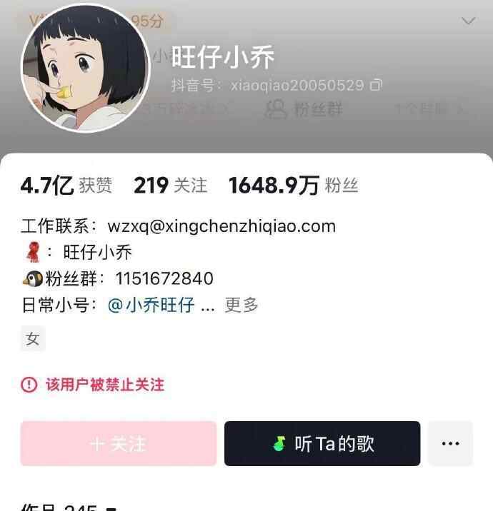 另据白鹿视频,7月27日,查询数据平台显示,旺仔小乔粉丝量2344.8万,而今日已掉至1648.9万,掉粉696万。