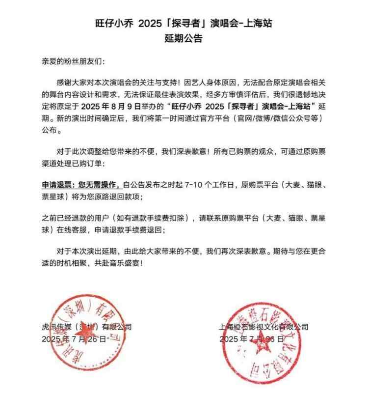 7月26日,旺仔小乔演唱会主办方发布延期公告称,因艺人身体原因,无法配合原定演唱会相关的舞台内容设计和需求,无法保证最佳表演效果,经多方审慎评估后,旺仔小乔2025“探寻者”演唱会-上海站延期。