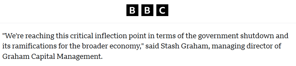 报道引用富国银行分析师最近的分析指出,之前的大多数政府停摆,尤其是长时间的政府停摆,其范围都非常有限。但今年“如果政府停摆持续到下周,我们将进入未知领域。”格雷厄姆资本管理公司董事总经理则表示:“就政府关门及其对整体经济的影响而言,我们正到达一个关键的转折点。”