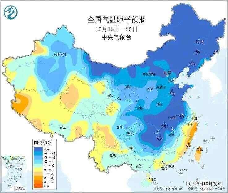 中央气象台10月16日至25日全国气温距平图,显示全国大部气温将转趋同比偏低