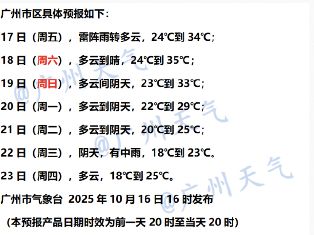 广州市气象台10月16日傍晚市区七天预报。图/新浪微博@广州天气