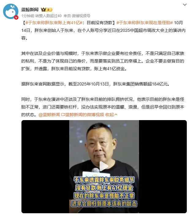 其中在谈及企业价值与规模时,于东来表示做企业要有社会责任,不是只满足自己家族的私利,不是为了体现自己的身价,而是要落实到员工的幸福上。企业不要去做盲目的扩张,并透露,胖东来目前没有贷款,账上有41亿资金。