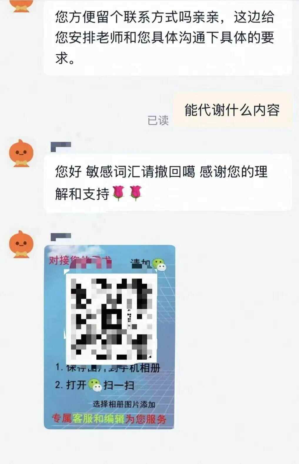 绕过平台监管,引流至企业微信等私域流量,是代写企业常用的手法,这也直接导致消费者的权益无法得到平台保障,在代写中诈骗时常发生。