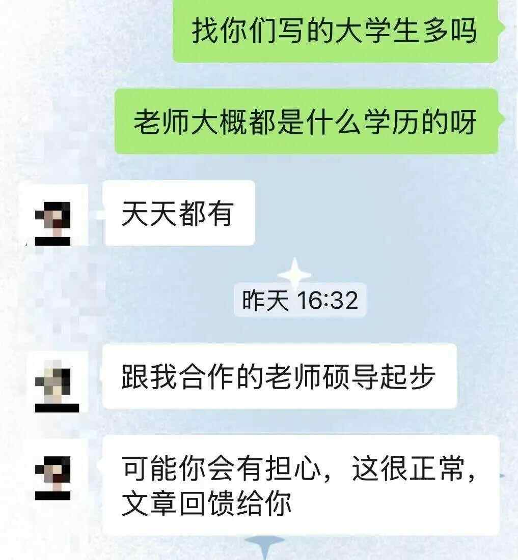 记者进一步询问写作老师的学历和专业,其中两家客服表示,“写作老师为硕导或博士”,更有代写声称“跟我合作的老师硕导起步”,但并未透露具体的专业内容。