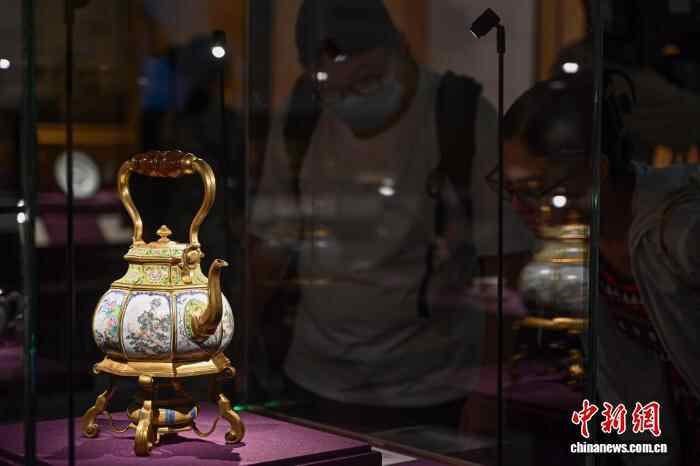 图为展出的“清乾隆款画珐琅八棱开光山水花鸟图提梁壶”。中新社记者 陈骥旻 摄