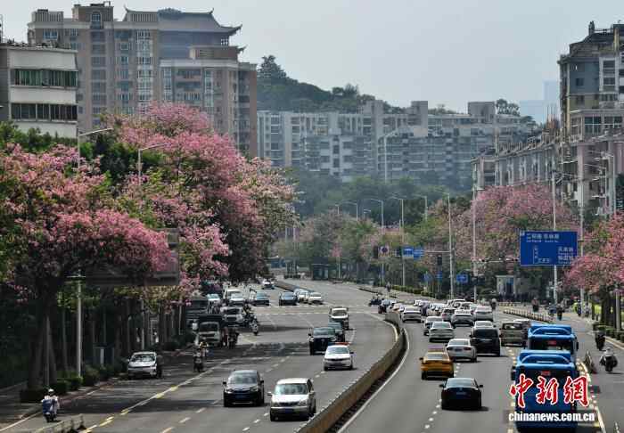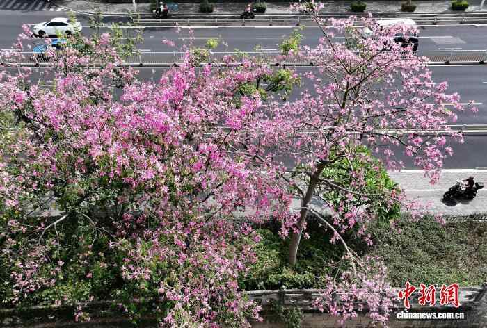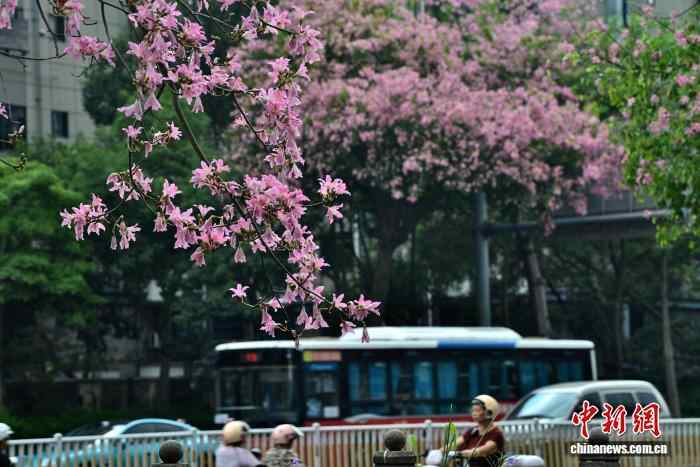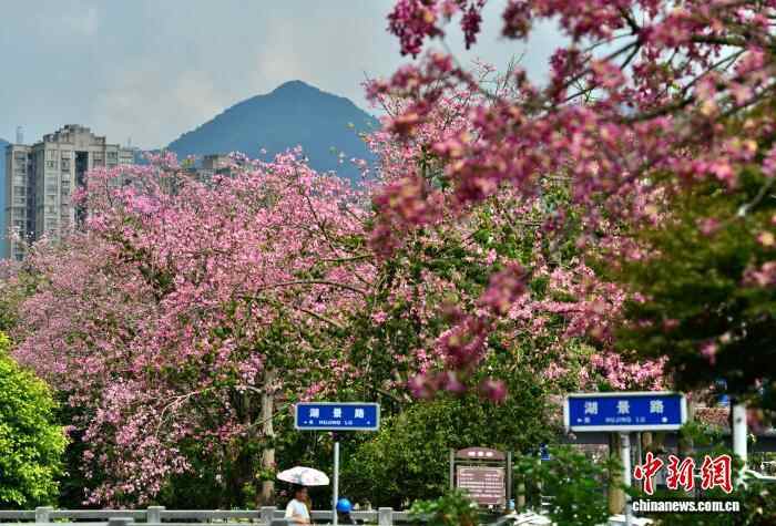 10月14日,“美人树”竞相盛开粉红色的花朵,为秋季榕城带来浪漫色彩。美丽异木棉又称美人树,是一种观花乔木,花期一般为10月到12月,竞相绽放的花朵将福建省福州市区多条道路装扮成粉色花海。中新社记者 张斌 摄