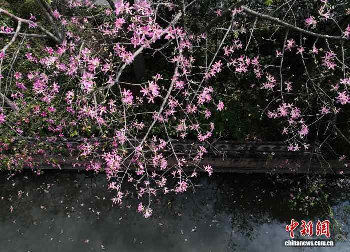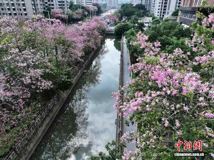 10月14日,“美人树”竞相盛开粉红色的花朵,为秋季榕城带来浪漫色彩。美丽异木棉又称美人树,是一种观花乔木,花期一般为10月到12月,竞相绽放的花朵将福建省福州市区多条道路装扮成粉色花海。(无人机照片)中新社记者 张斌 摄