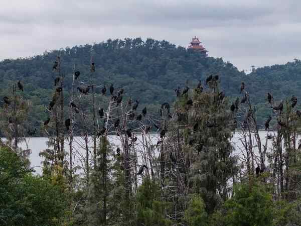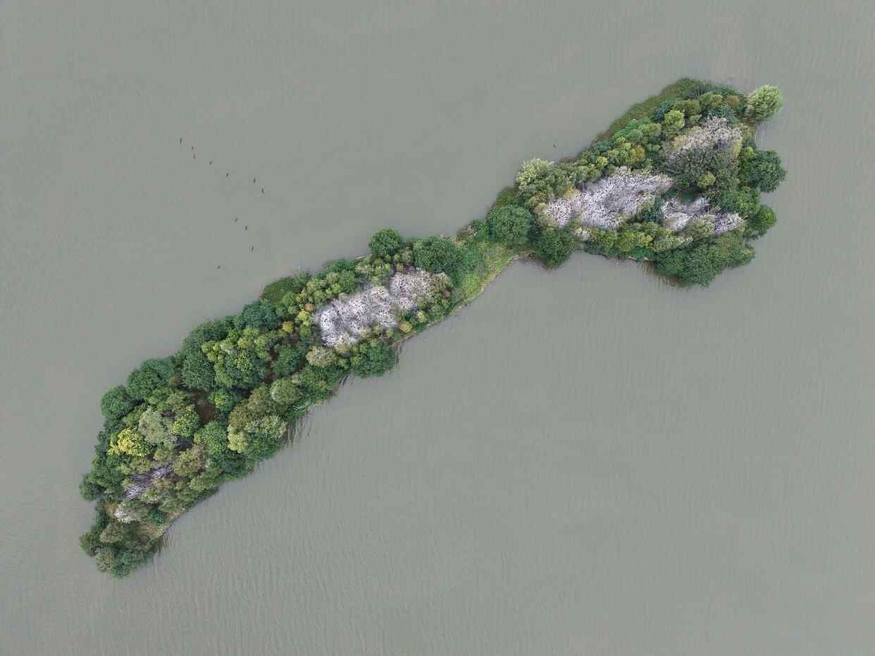 放眼望去,湖心小岛的树林中停满了通体乌黑的鸬鹚。从高处看,这座绿油油的湖心岛仿佛覆盖了一层积雪,实际上,这是它们的粪便把树木染成了白色。